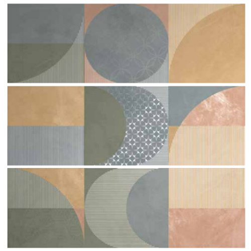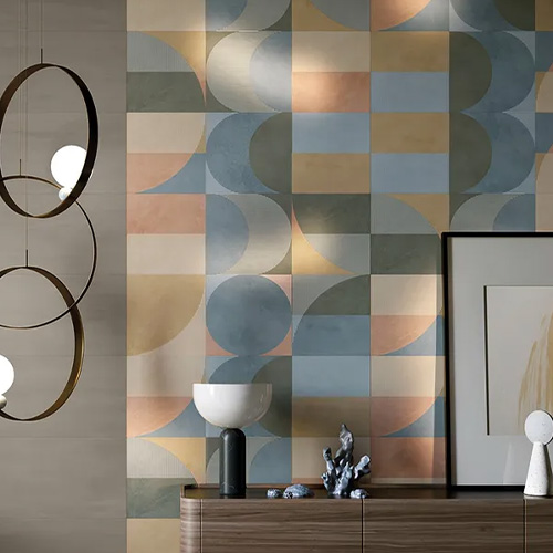 Homogén, pasztelszínű burkolatcsalád, amely jól kiegészül a geometrikus formákkal díszített dekorlapkkal.